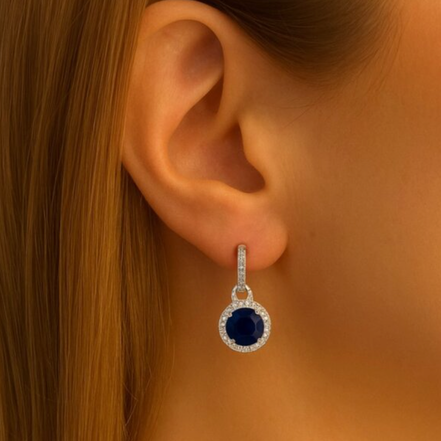 Gemstone Deep Sapphire Blue Colored center stone surrounded by cz Halo stones. Elevate any look with these earrings from everyday moments to formal events!