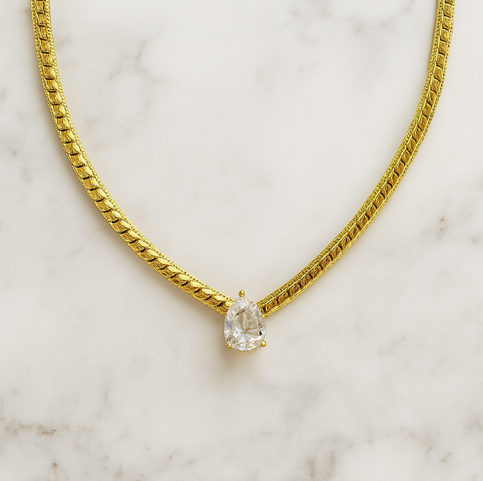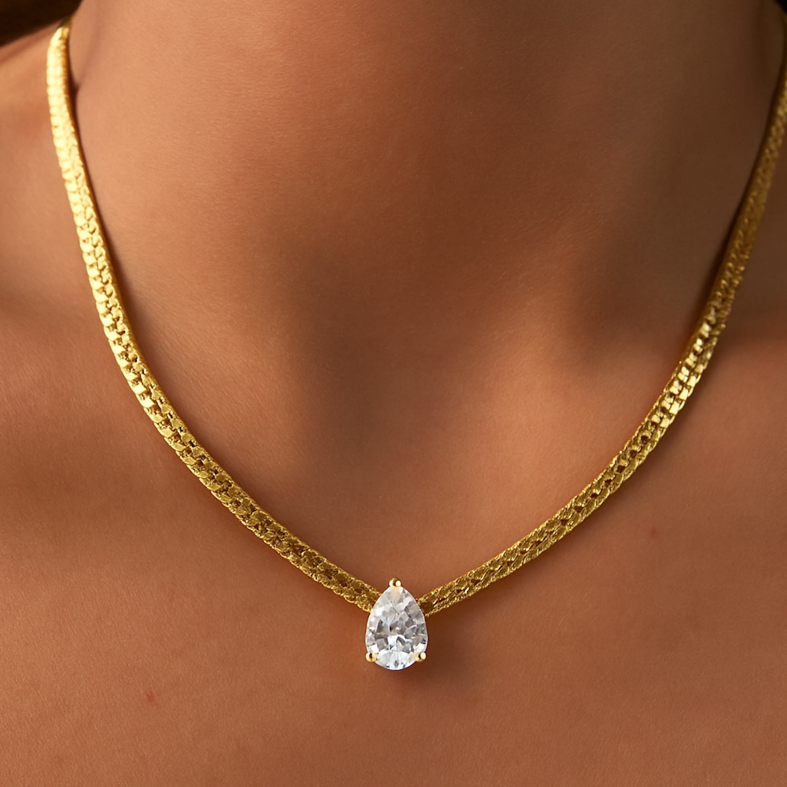 This fashion forward necklace is a showstopper with a luxe pear-shaped diamond-like center stone.